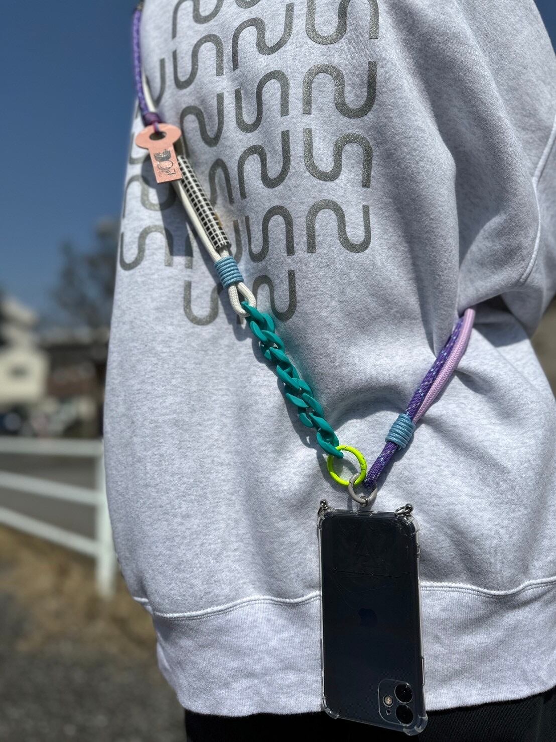 紐先のチェーンにはanusayaロゴマークの入った、スマホストラップホルダー付き(白ロゴ)