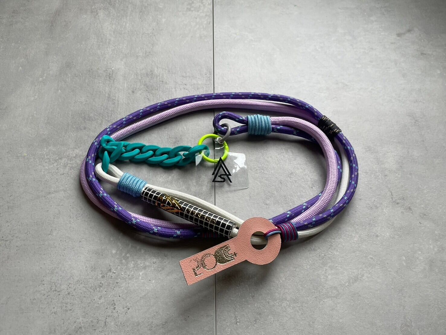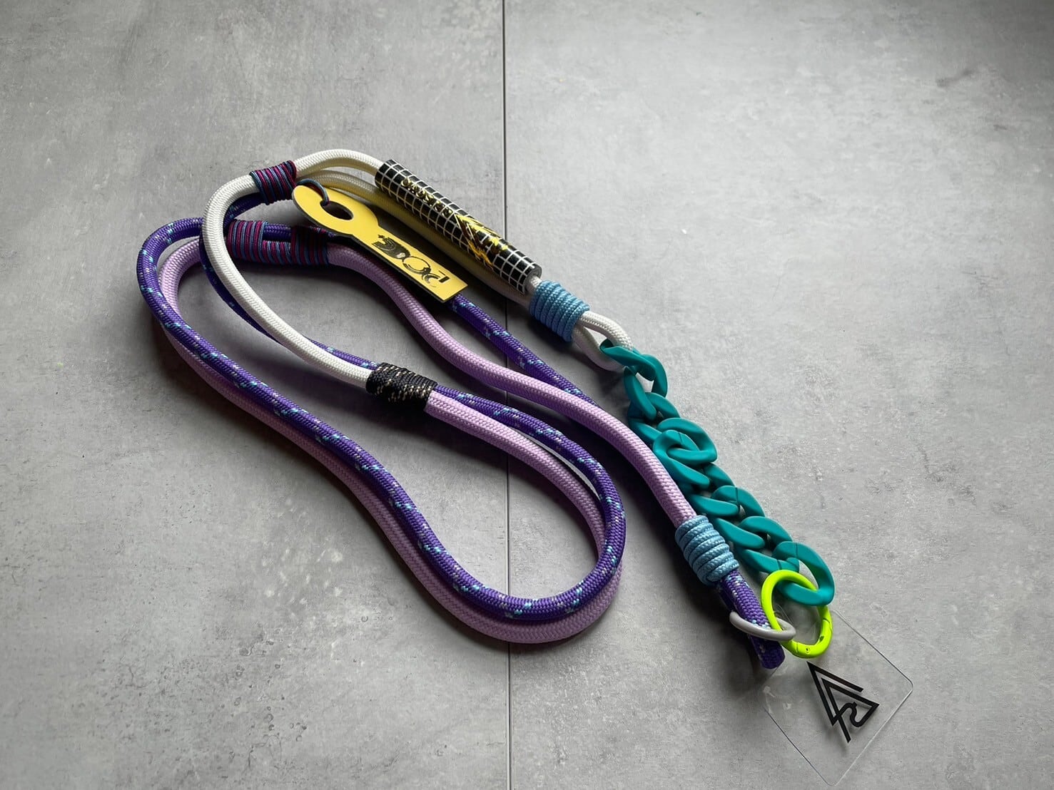複数のカラフルな紐やマットチェーンで組み上げた、個性的且つ遊び心の詰まったストラップとなっております。